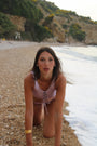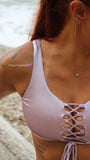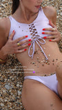 Il modello presenta un top con intreccio frontale regolabile che valorizza la silhouette, abbinato a uno slip dallo stile essenziale ma femminile. La modella in foto indossa una taglia S.